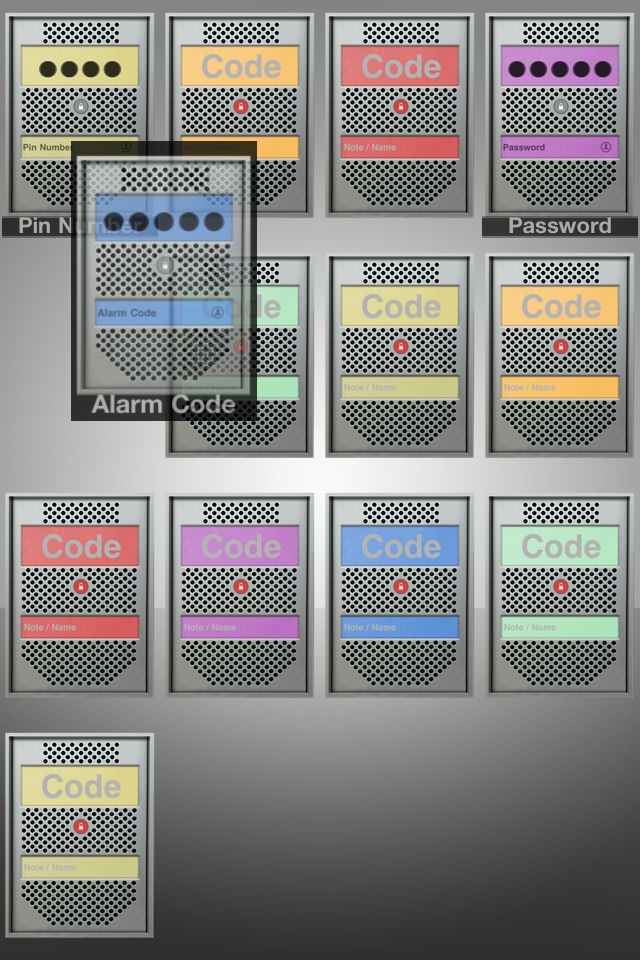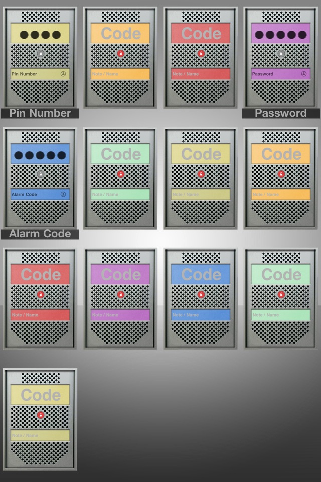 Codes Vault tracks info for up to 16 codes of any type. Each record contains fields for the code and a note or name. Each card can be skinned with one of six themes to help identify items. The code for the primary card can be shown on the app icon by tapping the star button.