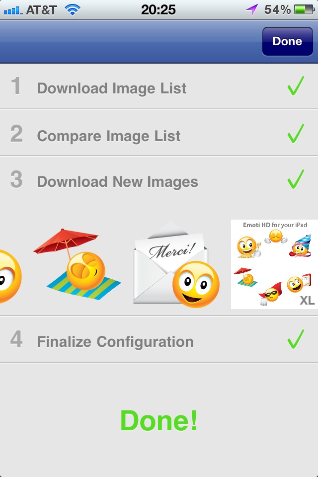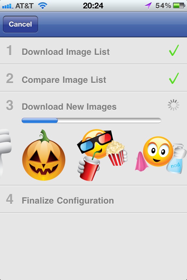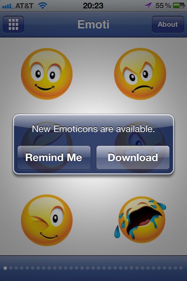Emoti includes support for downloading new emoticons directly from the app's site without having to install a new build. When new emoticons are available, the app alerts the user and offers to begin the download immediately or defer it till later.
