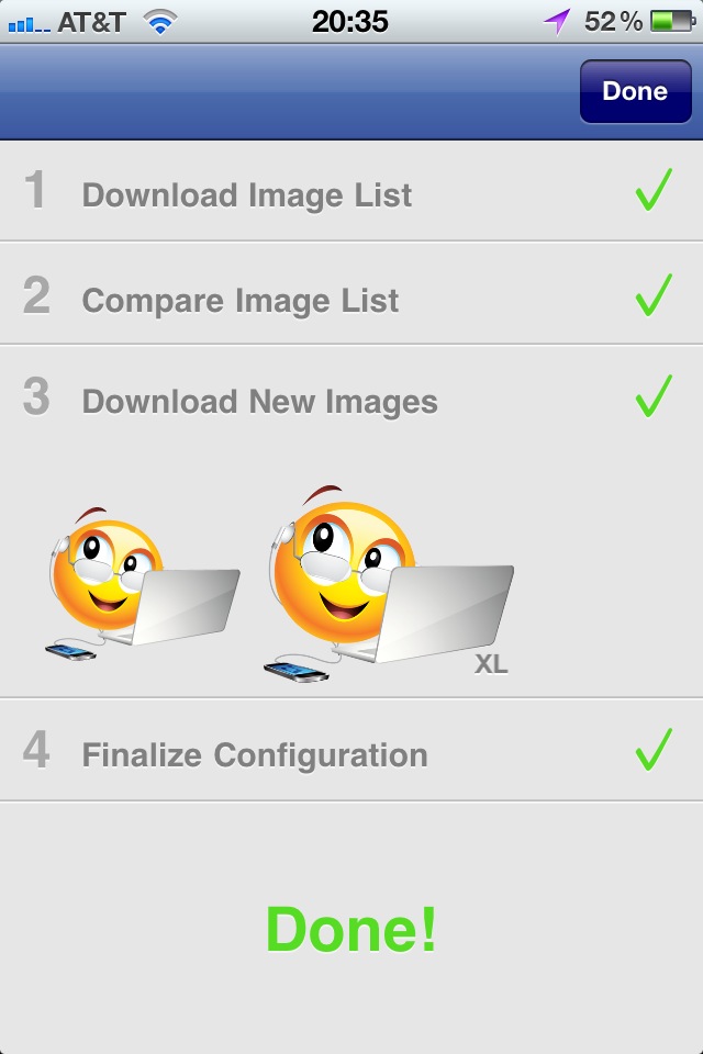 The download screen provides detailed information about the download progress, scrolls the new images across the screen as they are downloaded, and provides clear choices in the case of a failure.