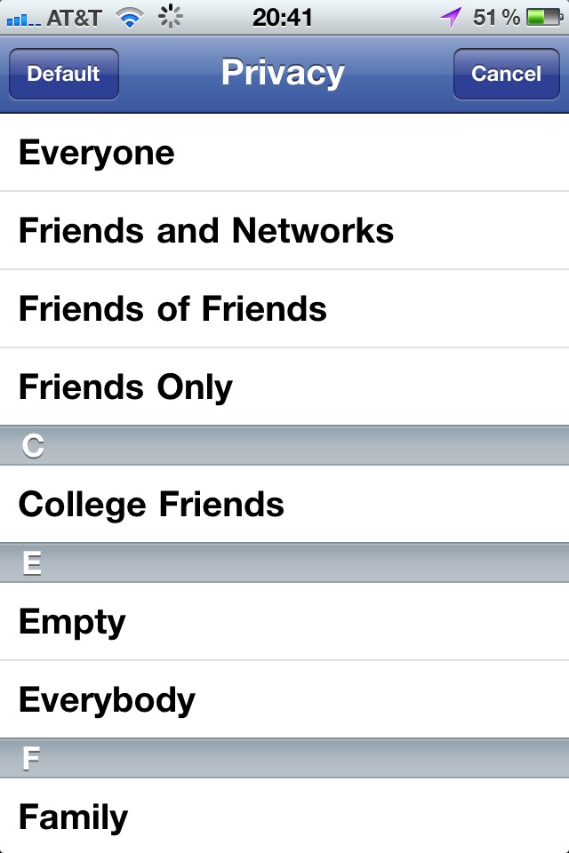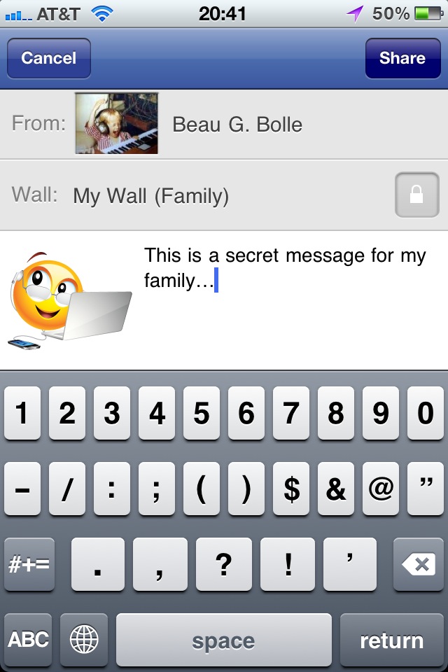 Posts to the user's own wall can be restricted to be visible to only certain users. Tapping the lock icon in the recipient field of the message composition screen displays the privacy screen. Any of the user's custom friend lists or one of Facebook's built-in privacy categories may be selected. When the post is made, only users in the permitted category or on the permitted list will see the post.