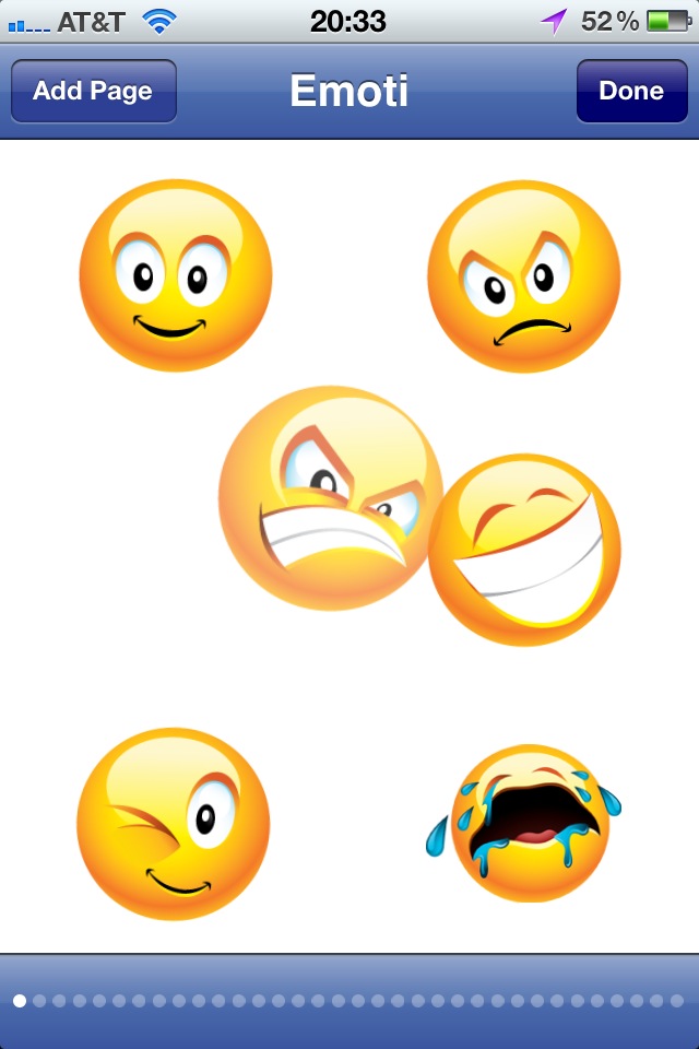 Tapping and holding an emoticon enters sort mode and the jiggling begins. Emoticons can be picked up by tapping and holding and then may be dropped in any spot on the page, or even dragged between pages by moving to one of the sides of the screen. The always-available Add Page button obviates the need to scroll to the very last page just to create a new one.