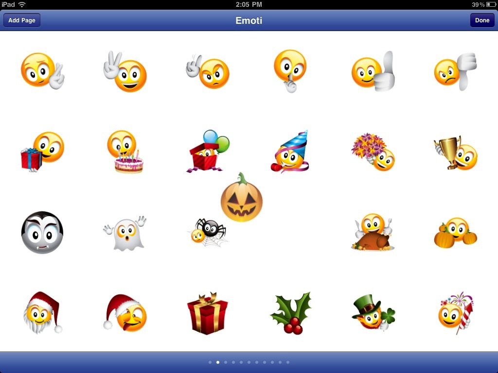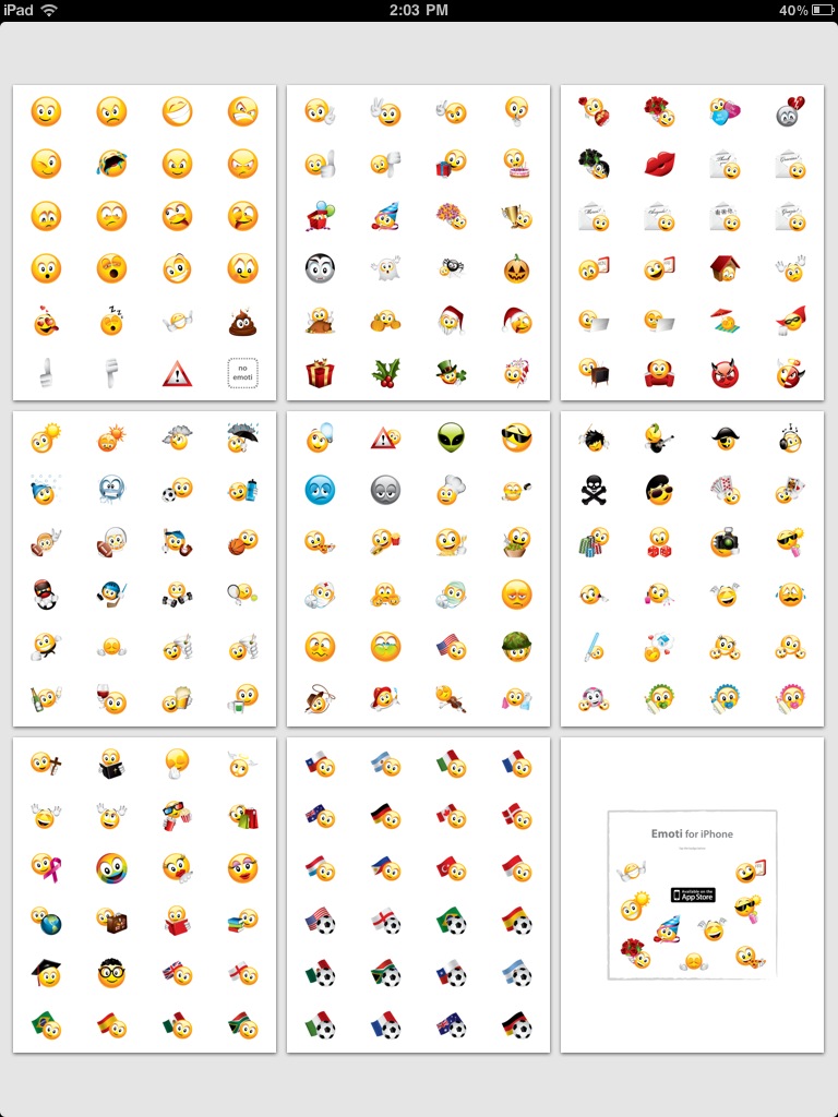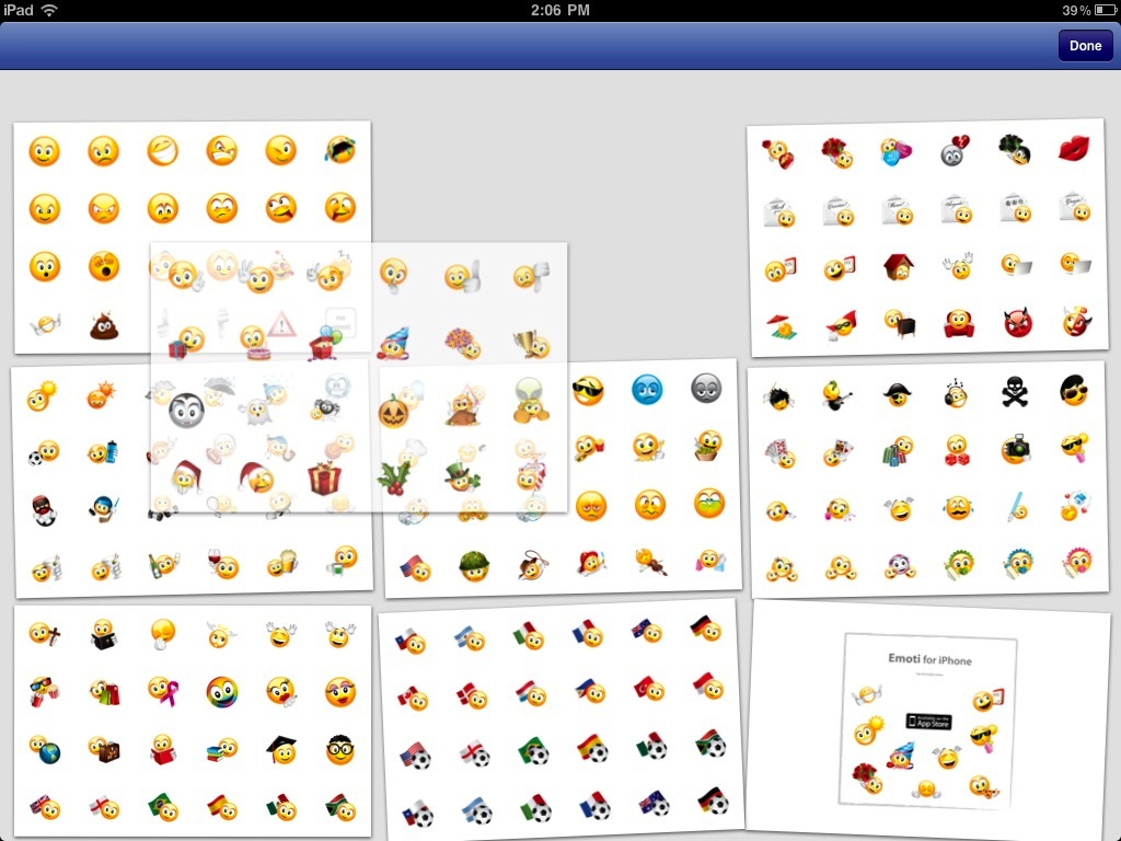 The app uses the extra space provided by the iPad's screen to show off the emoticons by putting four times as many emoticons on each page. Zoom view is even more stunning on the larger screen.