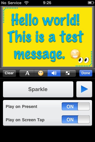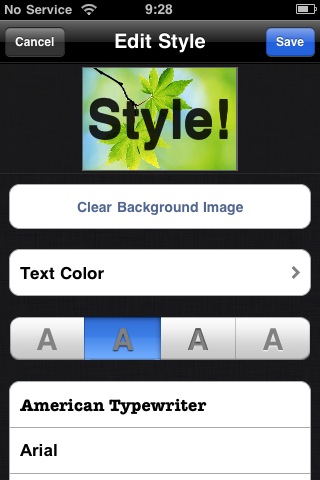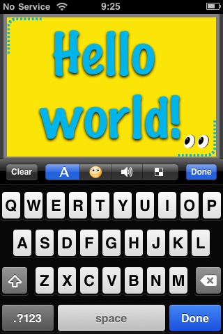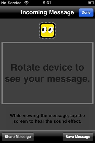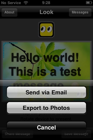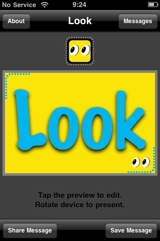 Look offers full screen messaging with a variety of fantastic backgrounds, emoticons, sound effects, fonts, and customizable text colors. Create your message and rotate the device to present it. It is especially useful for getting the attention of someone across the room.