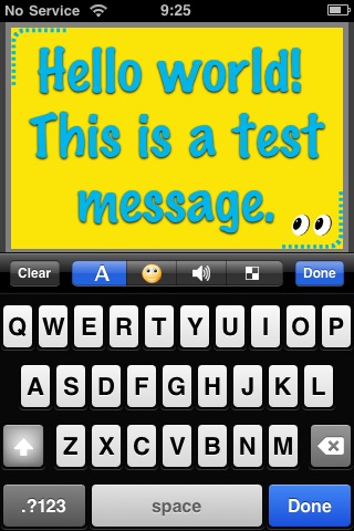 A custom keyboard accessory provides access to alternate input interfaces to insert emoticons, select sound effects, and apply themes to the message.