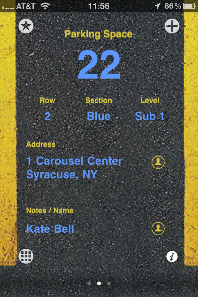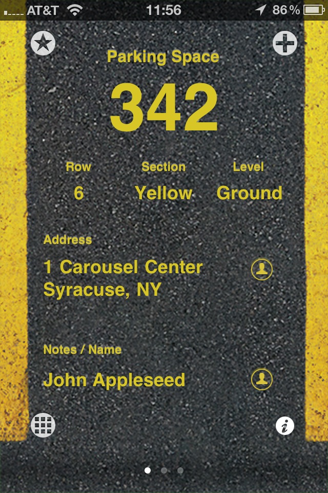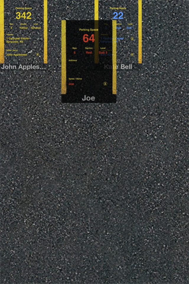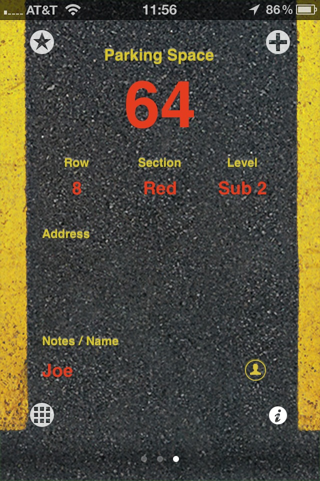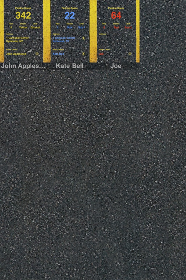 Parking Space tracks parking space info for up to 16 vehicles. Each record contains fields for commercial parking structures, an address, and the driver's name. Each card can be skinned with one of six themes to help identify items. The parking space number for the primary card can be shown on the app icon by tapping the star button.