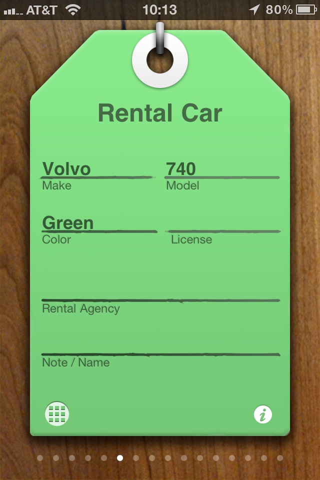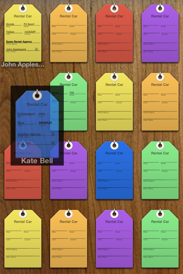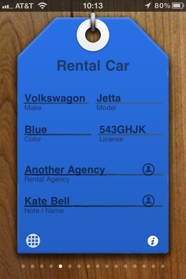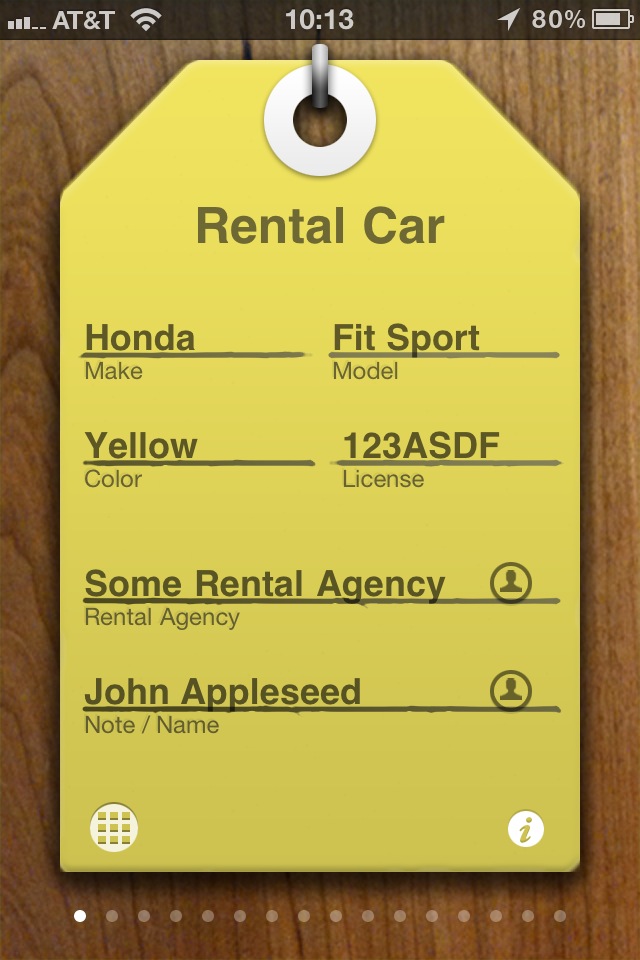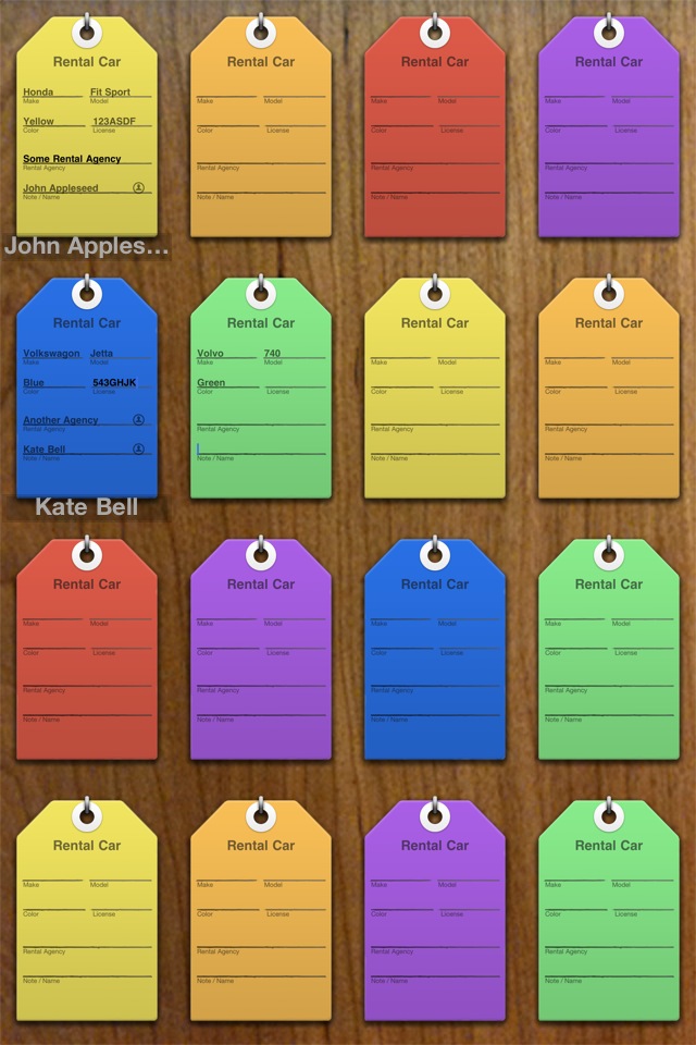 Rental Car Info tracks up to 16 rental vehicles. Each record contains fields for the vehicle's info, rental agency contact, and the driver's name. Each card can be skinned with one of six themes to help identify items.