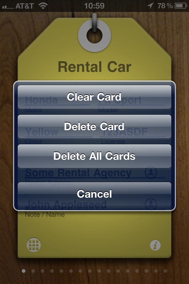 While editing a field, shaking the device invokes the OS-provided undo/redo behaviors. While viewing a card, shaking the device displays an alert view with options for clearing and deleting cards.