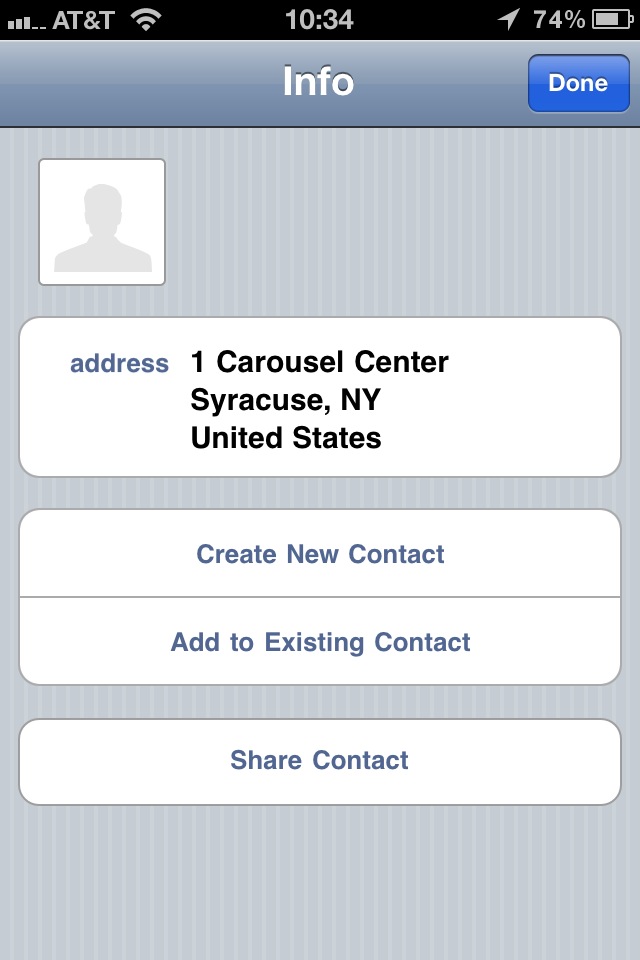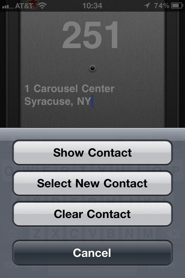 Name, address, and phone number field data can be entered manually or fetched from the user's contacts database by tapping the accessory view contact button. Manually-entered information can be used to create a new contact or added to an existing contact. Once a link has been established, the field's contact button provides direct access to the contact entry.