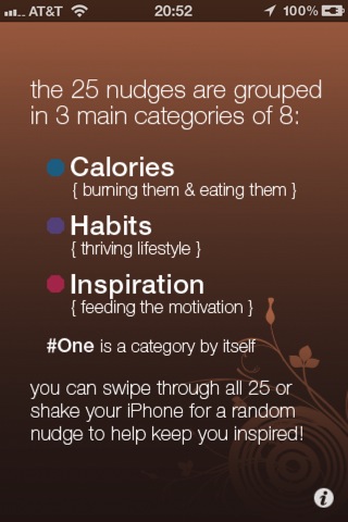 The app contains 25 nudges in three categories. They can be navigated by swiping left and right, or the device can be shaken to display a random nudge.