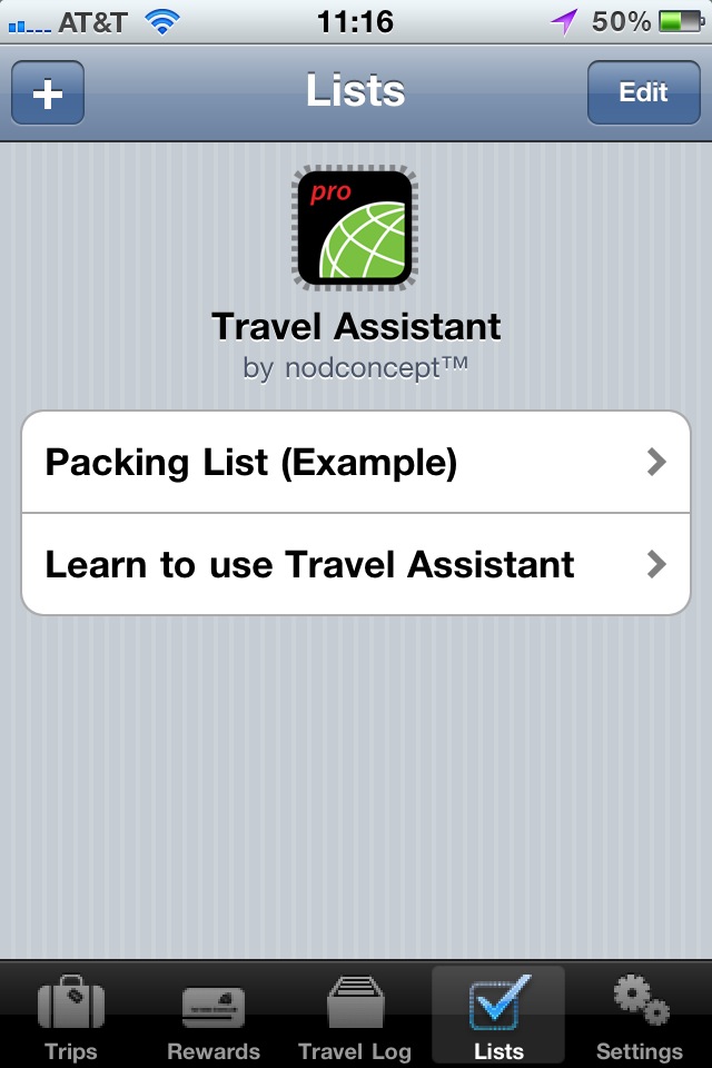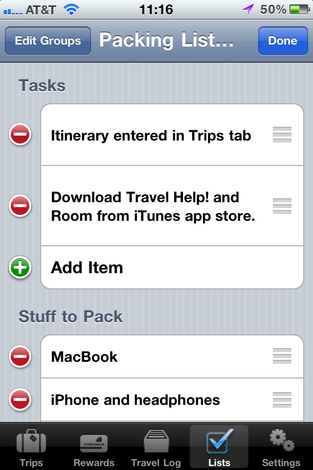 The Lists tab provides a powerful tool for packing and task lists. Each item can have any length of text, in case a task requires more than a few words to describe.