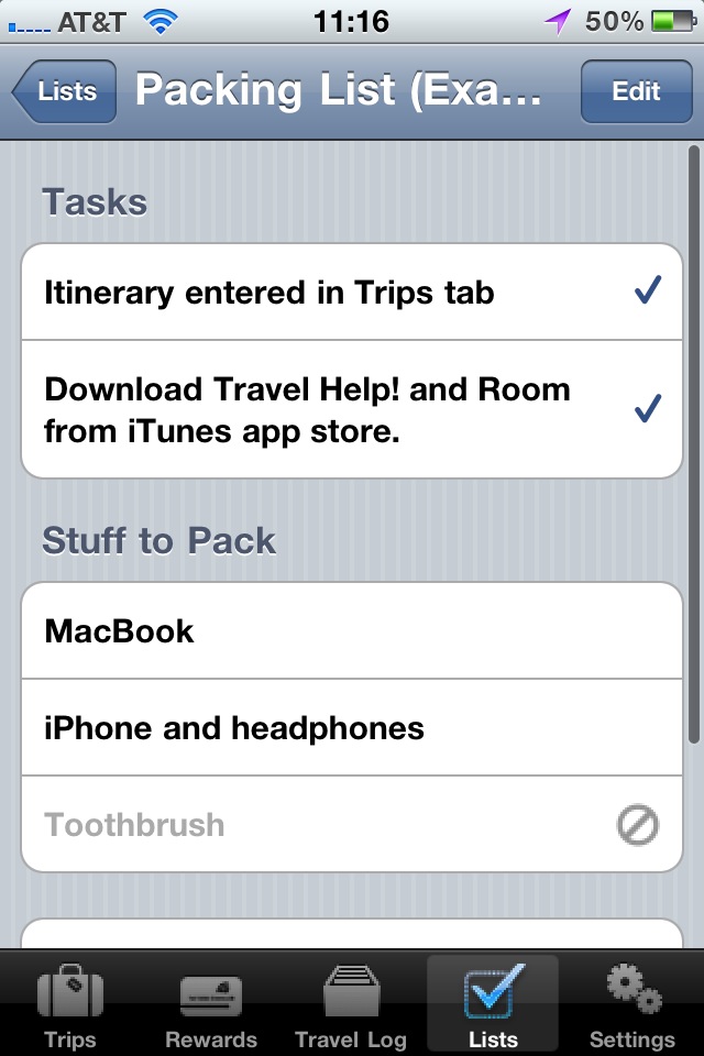 If a given item doesn't apply to the current trip, it can be disabled with a double-tap, allowing it to remain on the list and available for the next trip.